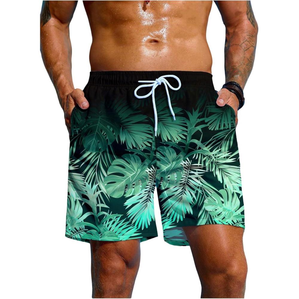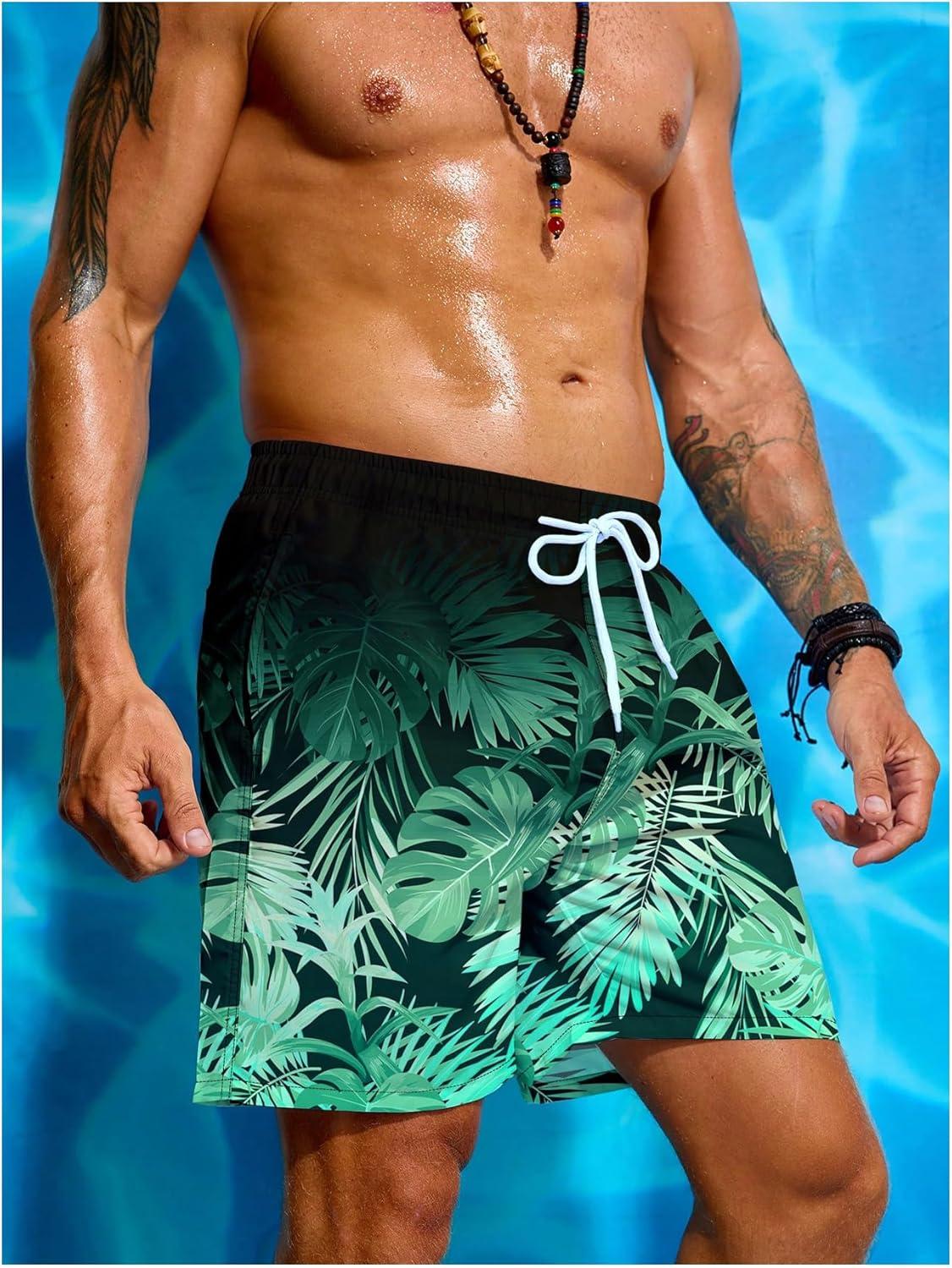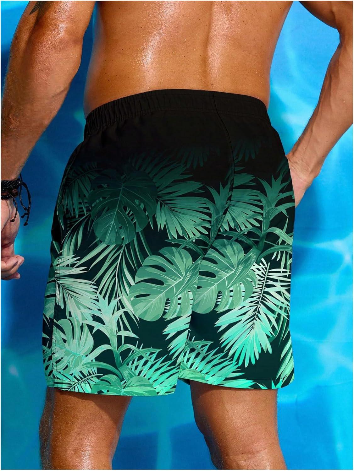 Verdusa Men's Tropical Print Drawstring Waist Swim Trunks Beach Shorts(Dark Green)