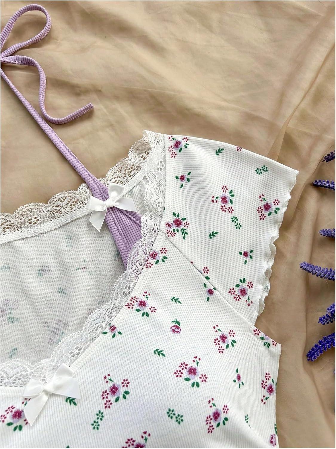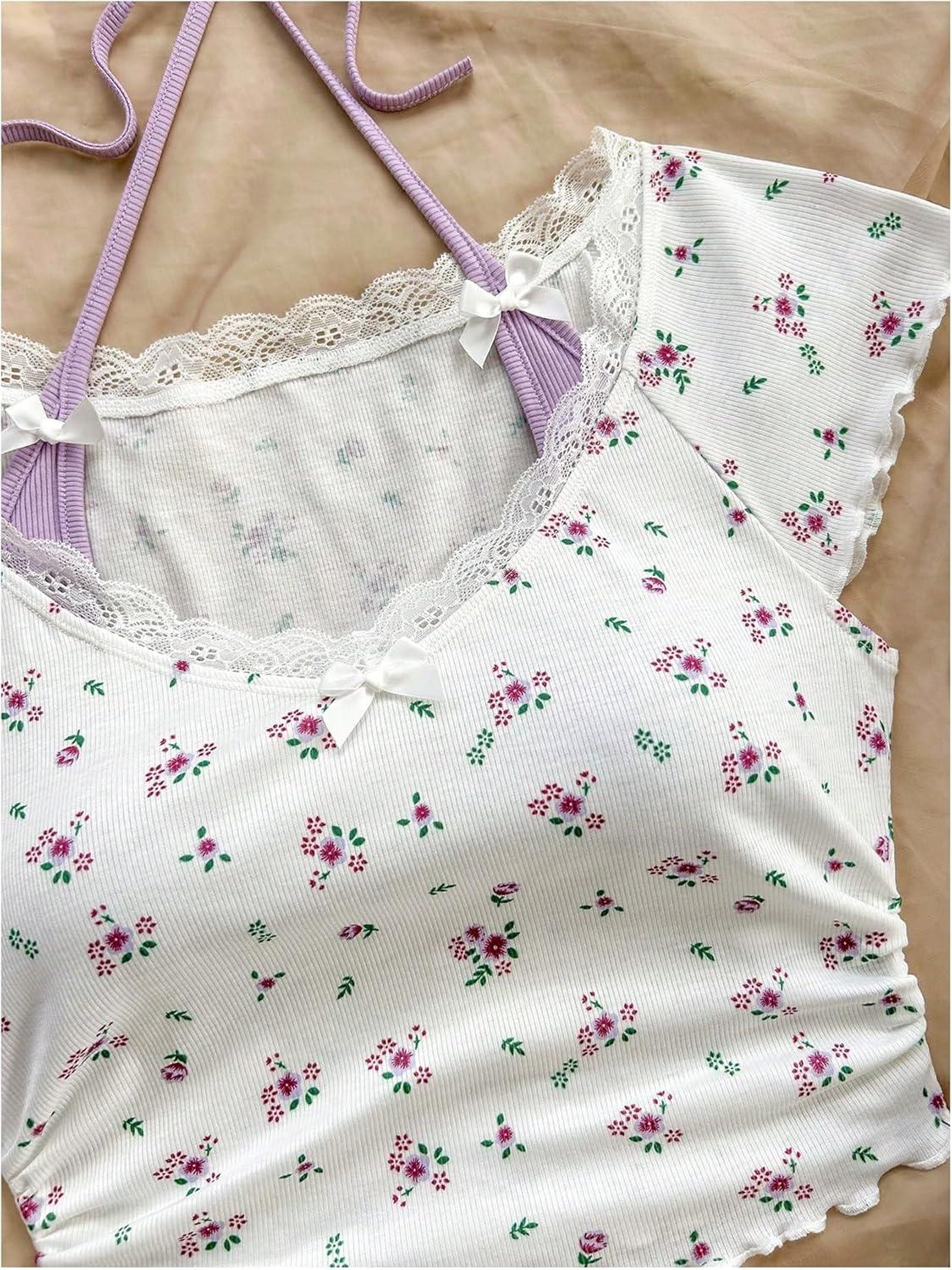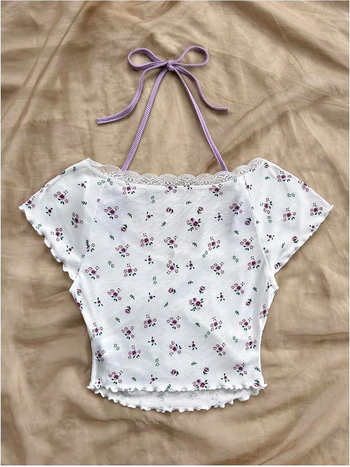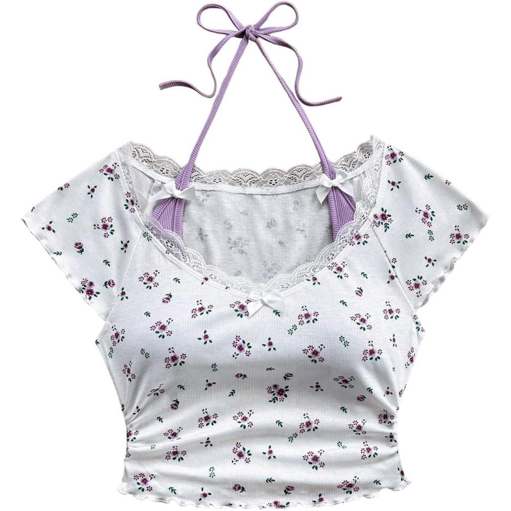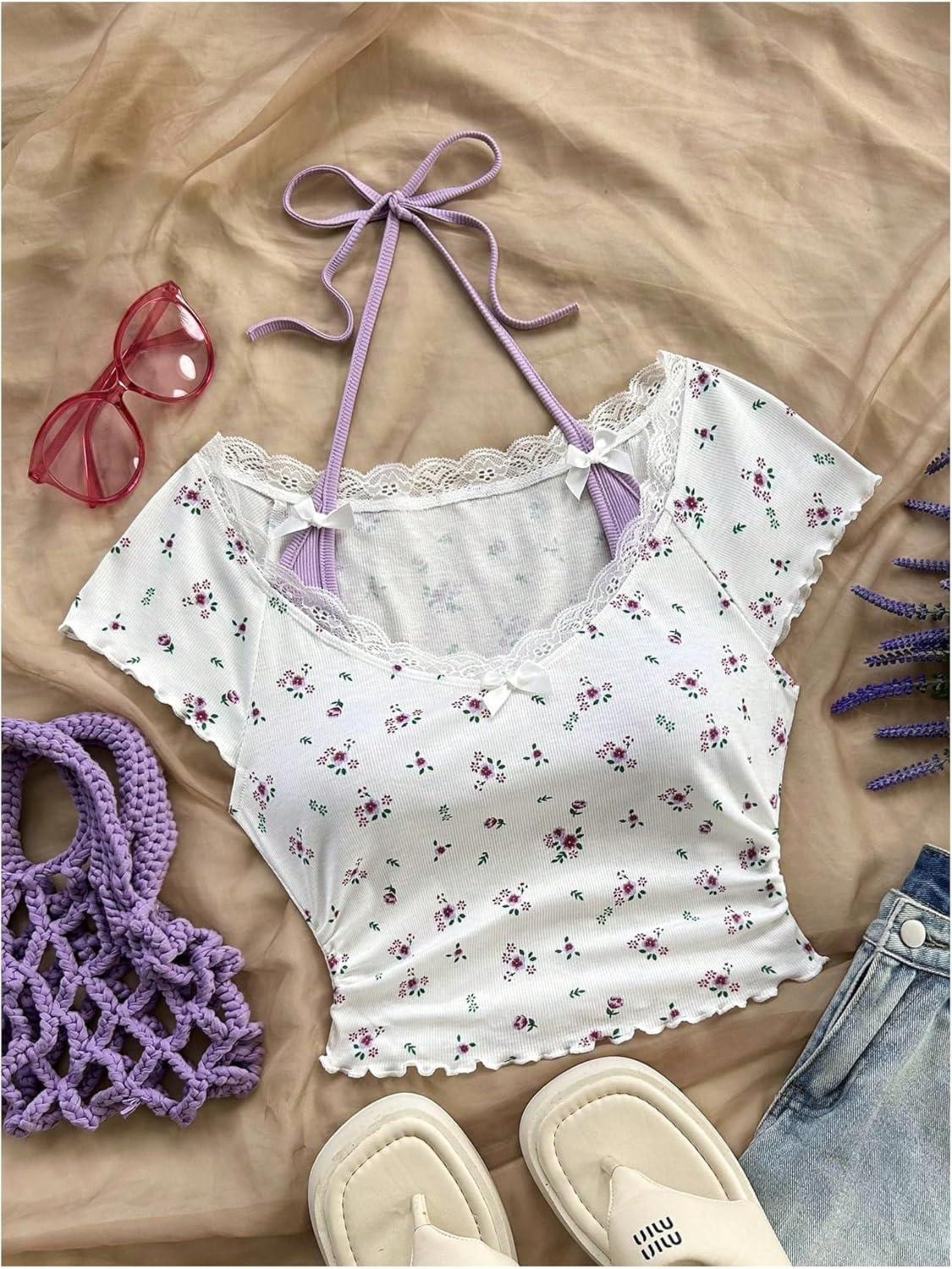 Get more for your money with our exclusive bundle deals on Verdusa Women’s Contrast Lace Halter Neck Lettuce Trim Casual Crop Tee Tops(Purple) and accessories.