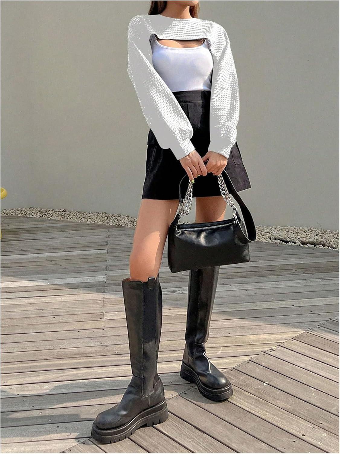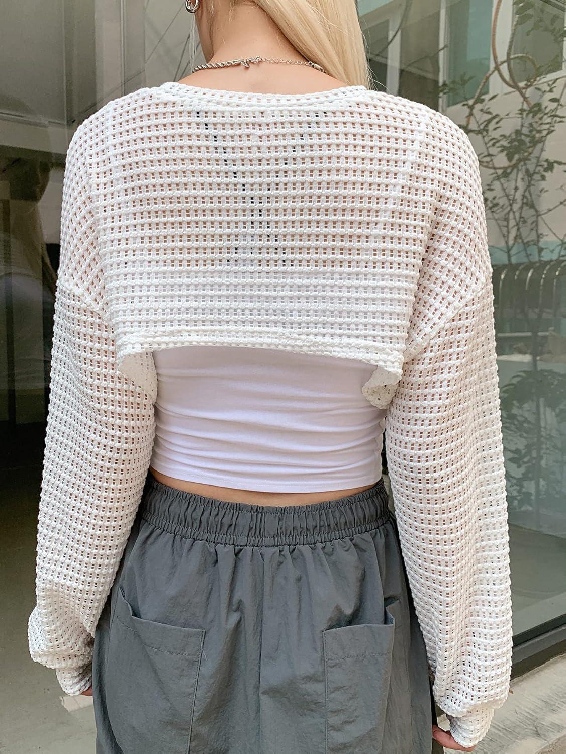 Verdusa Women’s Crop Cover Up Long Sleeve Pointelle Knit Hollow Out Crochet See Through Knit Top(White)