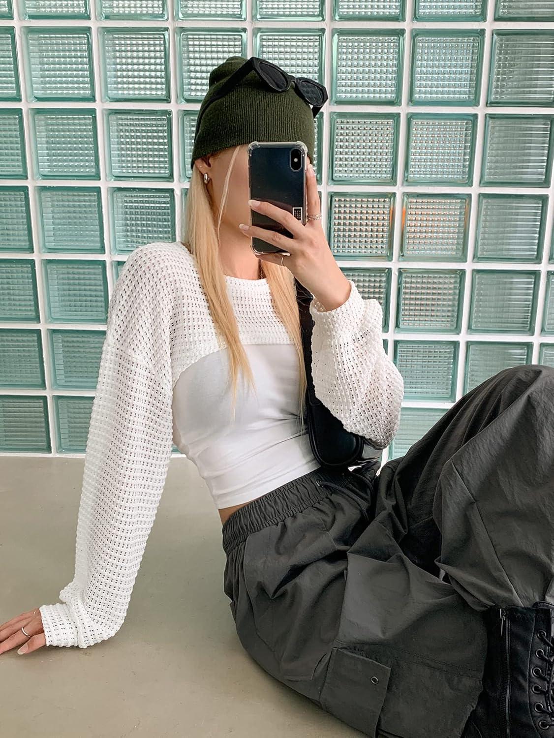 Verdusa Women's Crop Cover Up Long Sleeve Pointelle Knit Hollow Out Crochet See Through Knit Top(Light White)