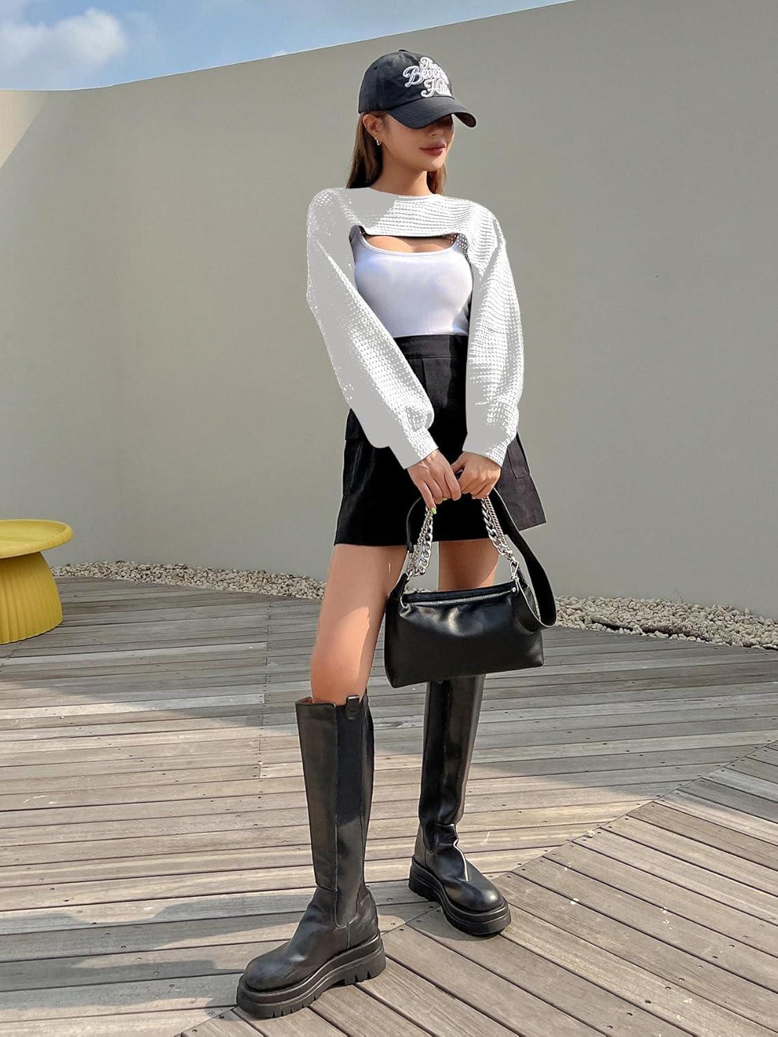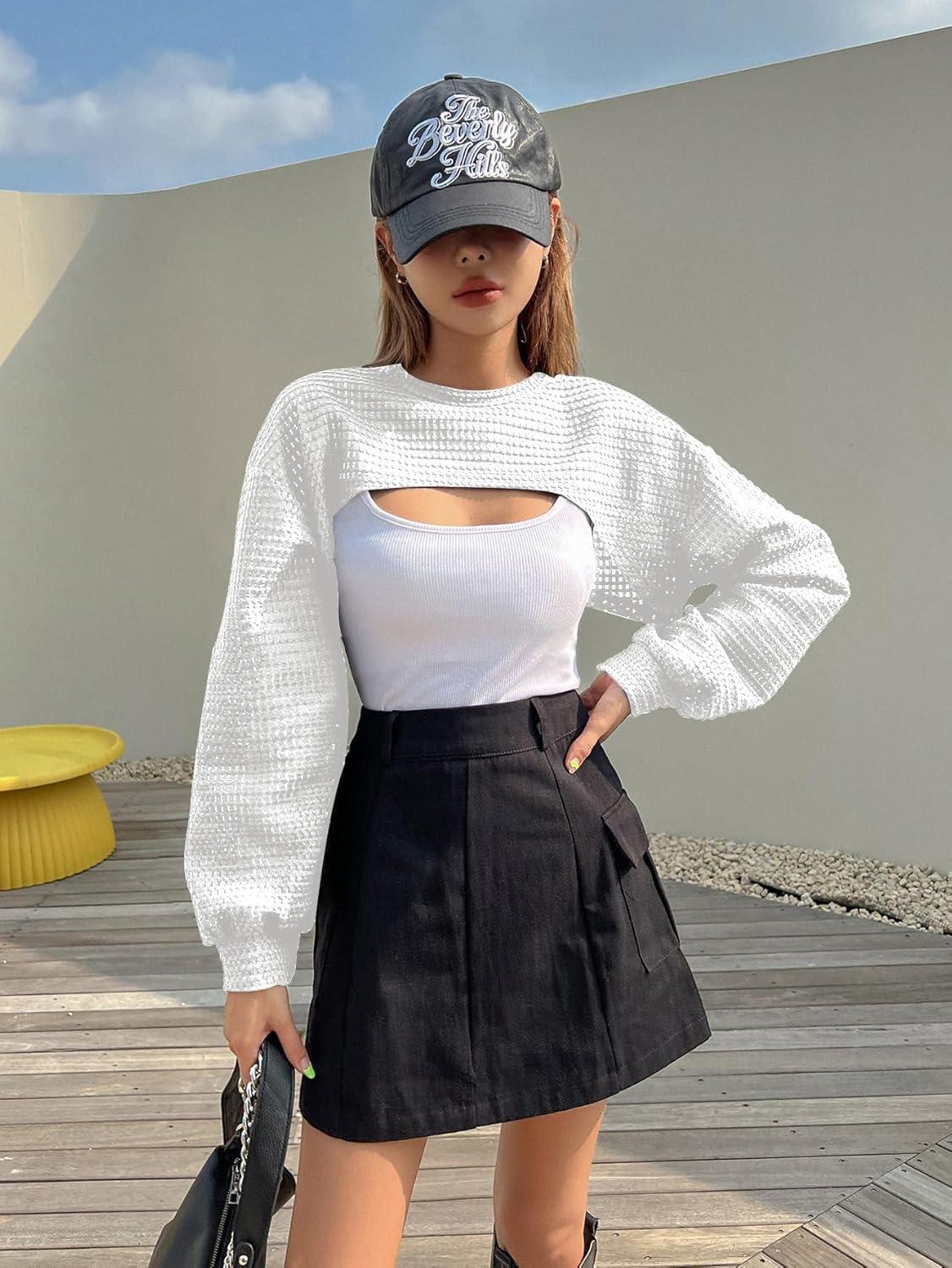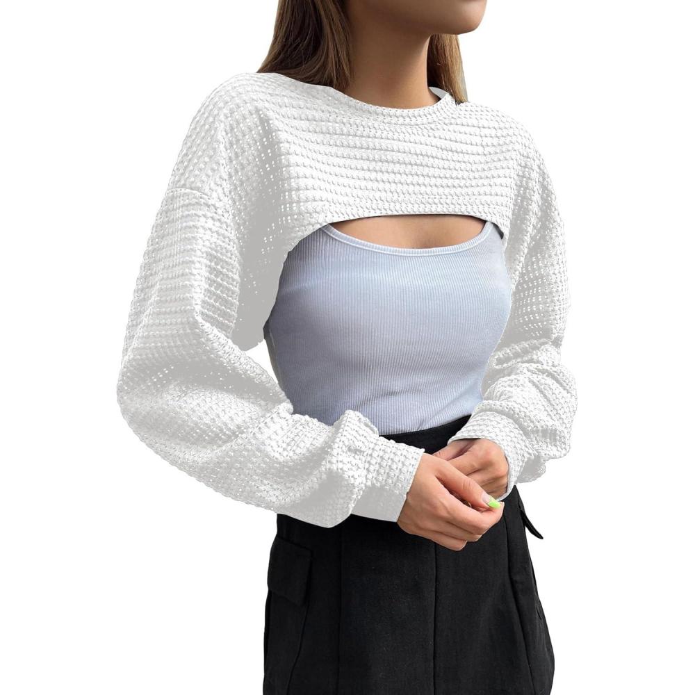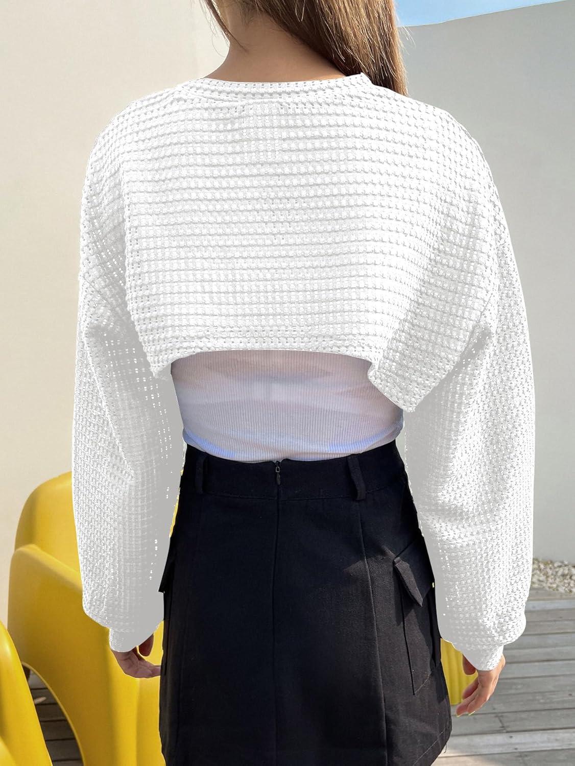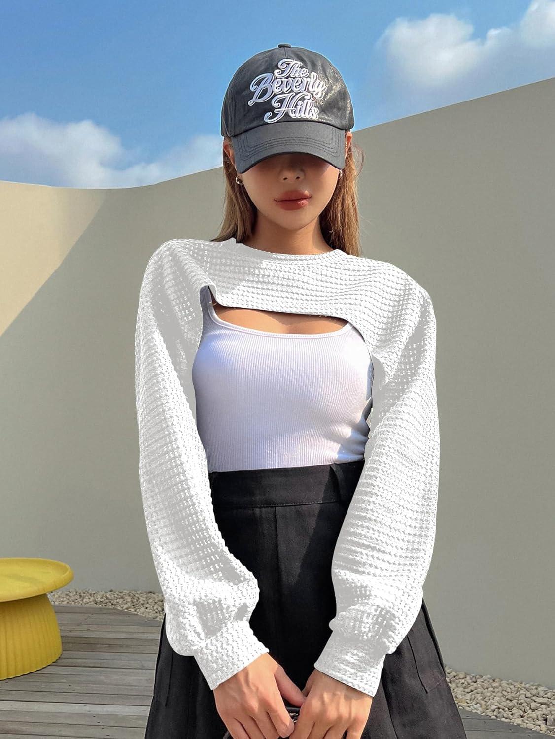Verdusa Women’s Crop Cover Up Long Sleeve Pointelle Knit Hollow Out Crochet See Through Knit Top(White)