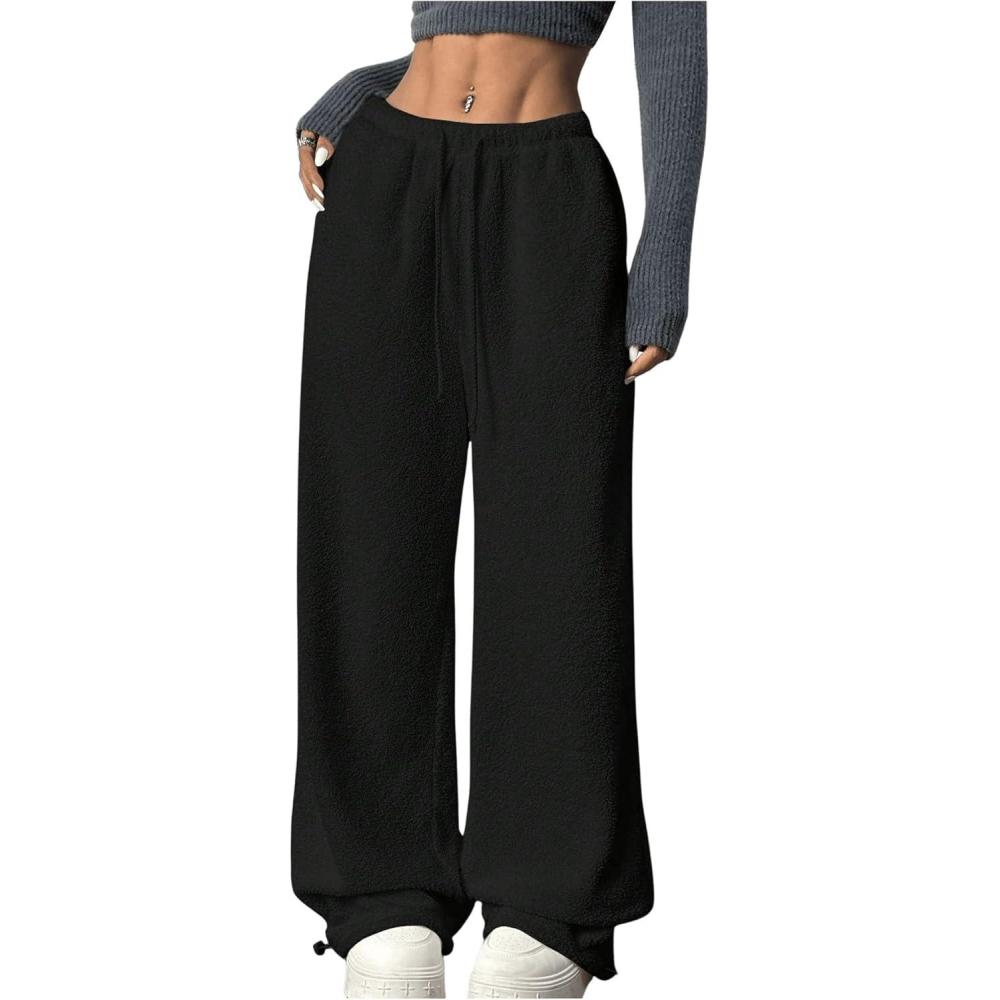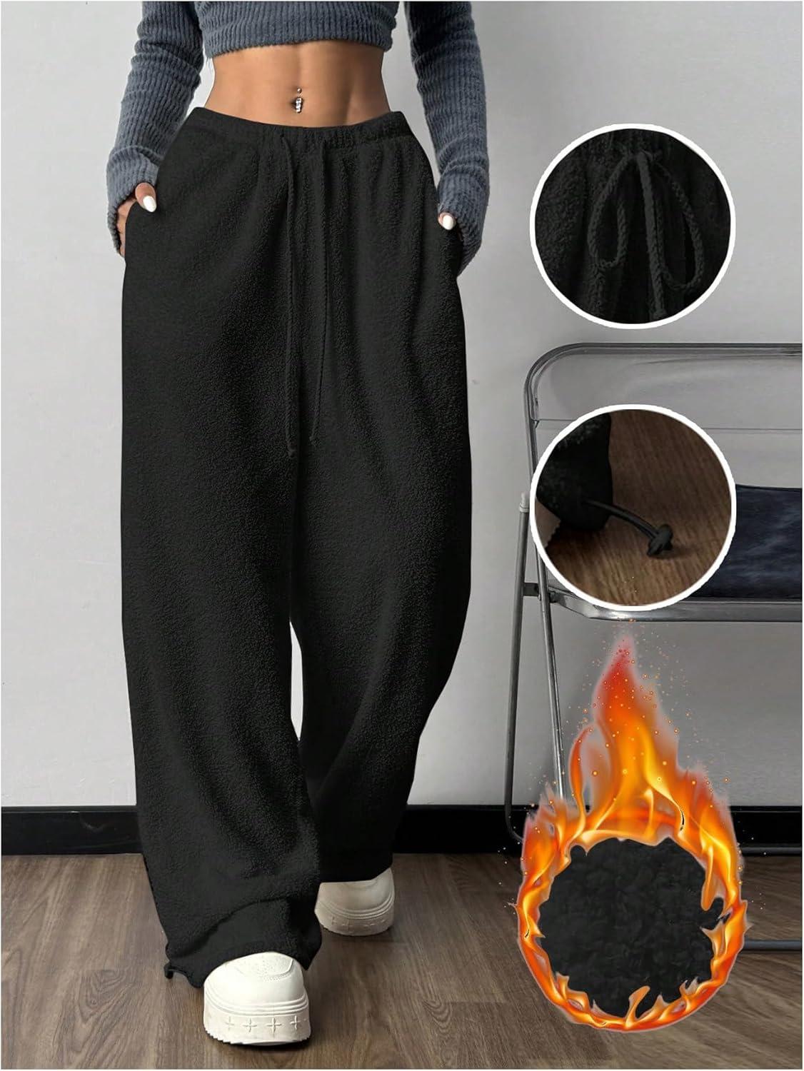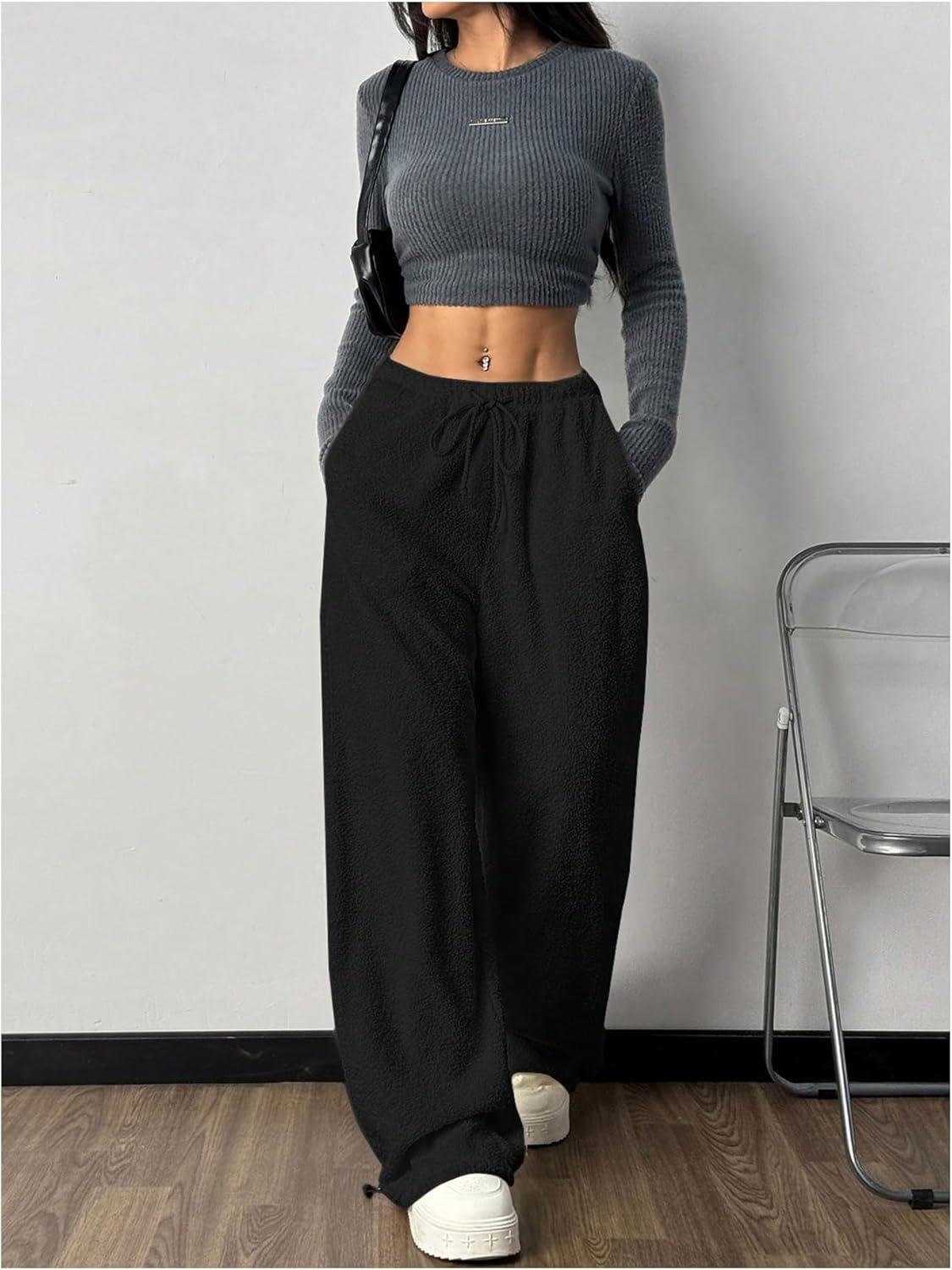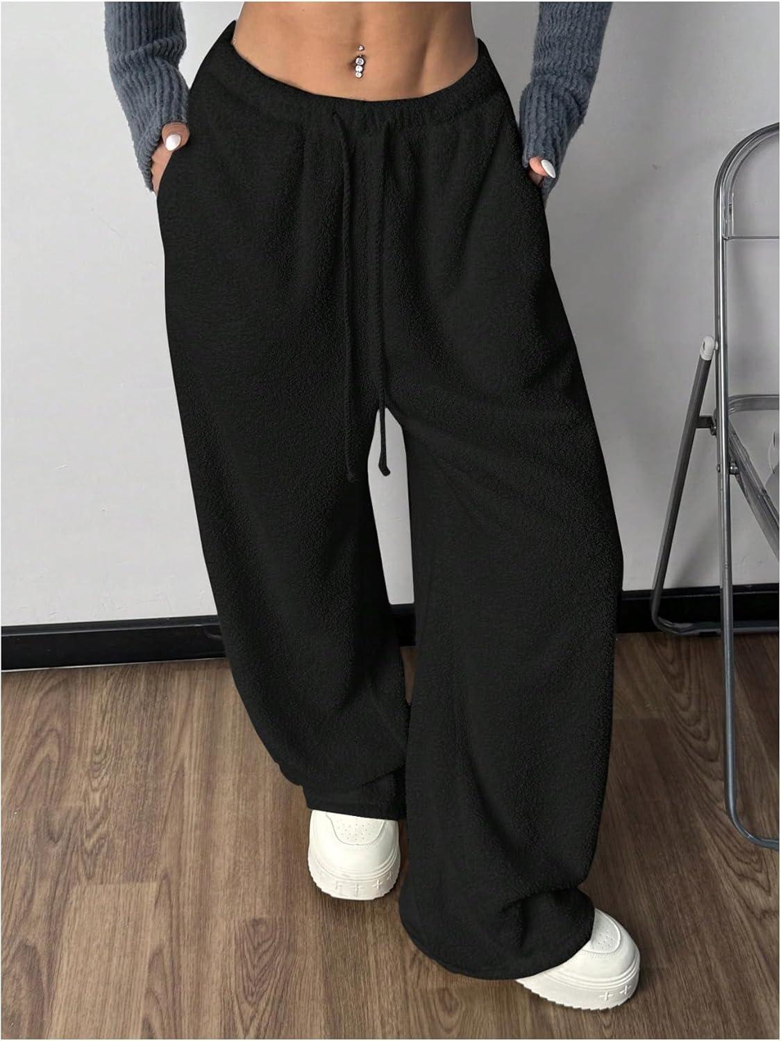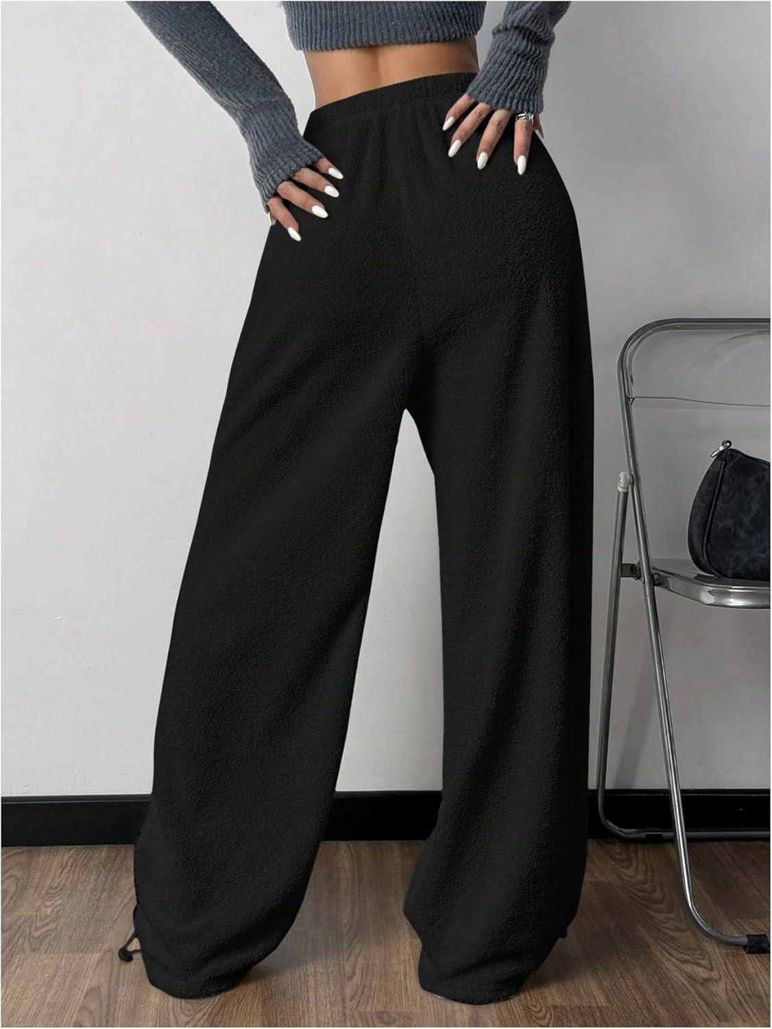 Verdusa Women’s High Waist Fuzzy Fleece Lounge Long Pants Pajama Pants(Solid Black)