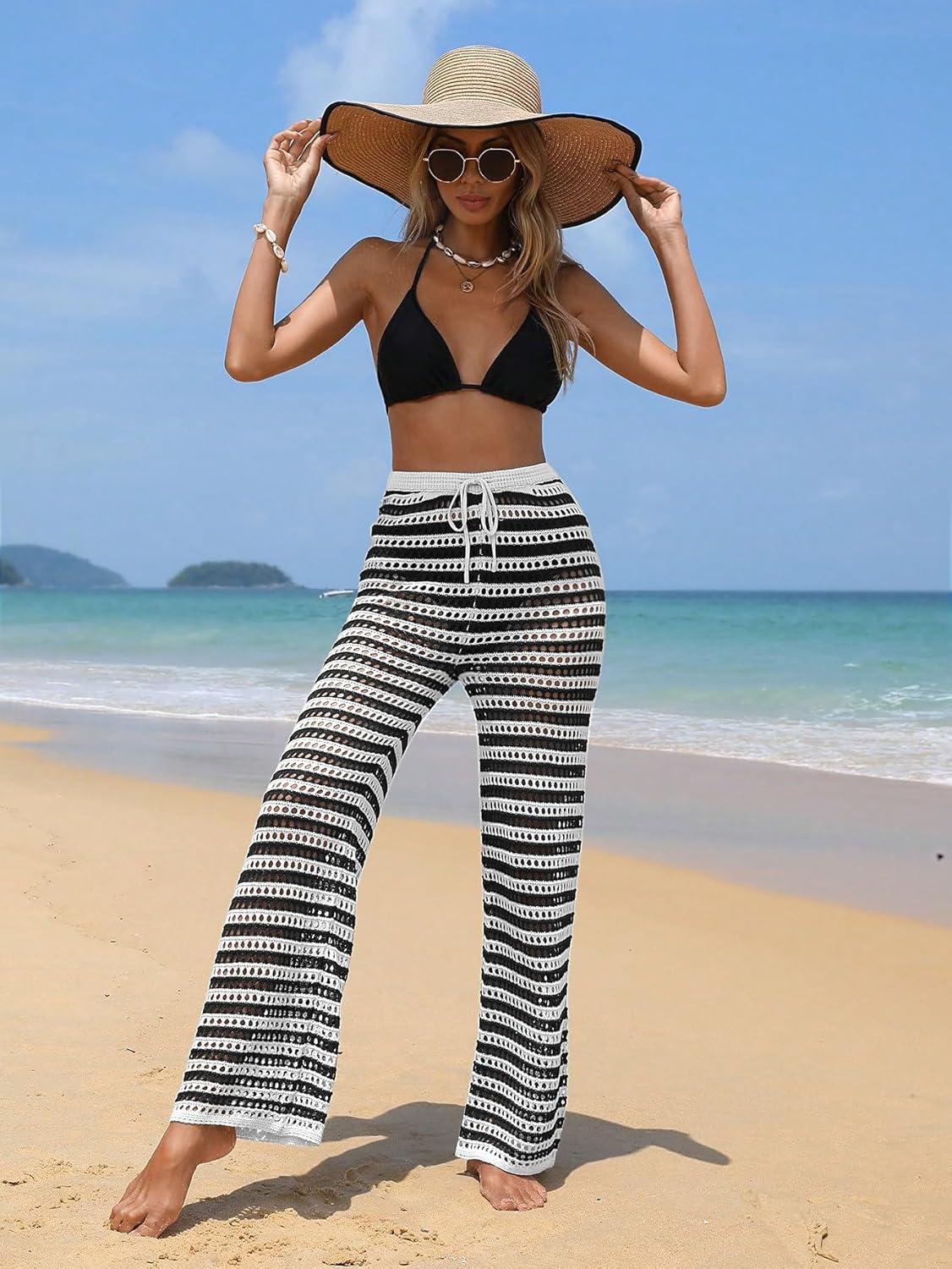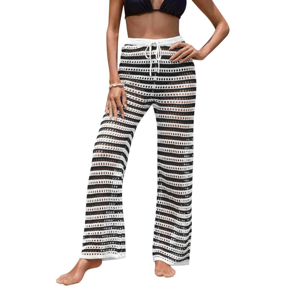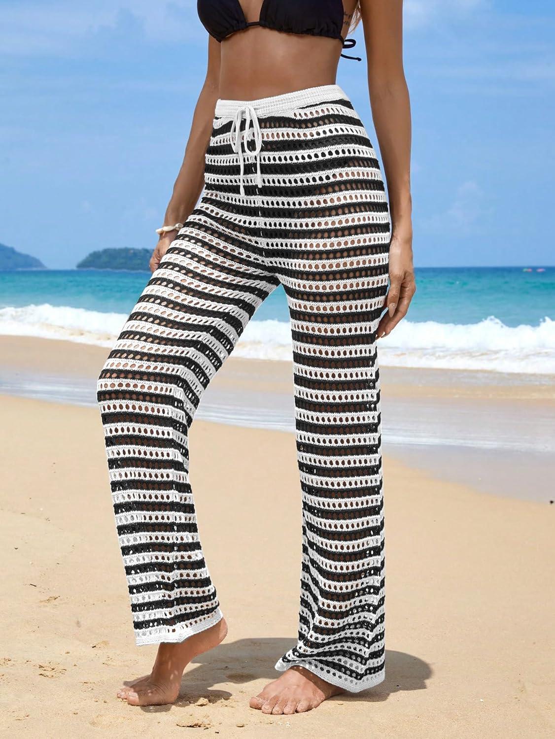 imageVerdusa Womens Hollow Out Crochet Knit Striped High Waist Swimwear Cover Up PantsBlack and White