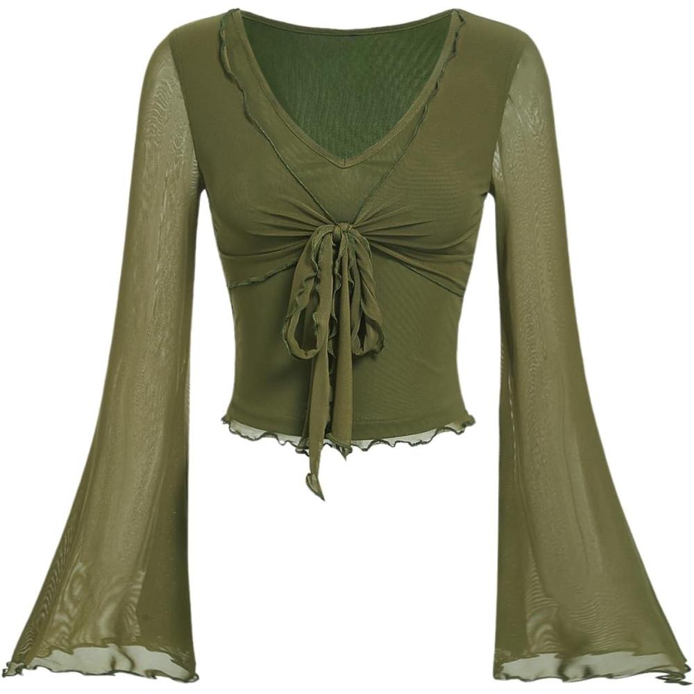 Verdusa Women’s Y2K Long Sleeve Tops Goth Mesh Mock Neck Bell Sleeve Crop Tops(Plant Green)