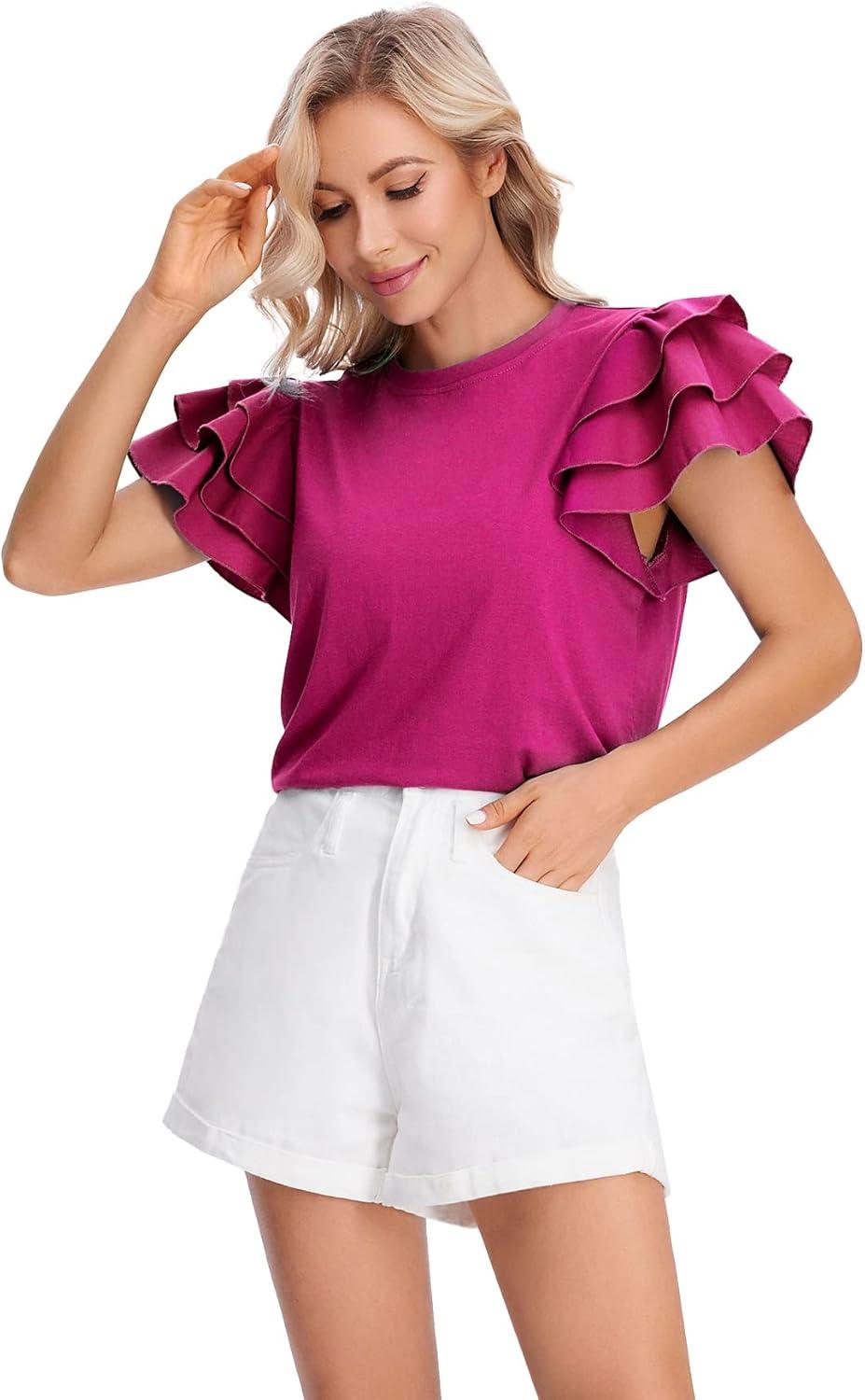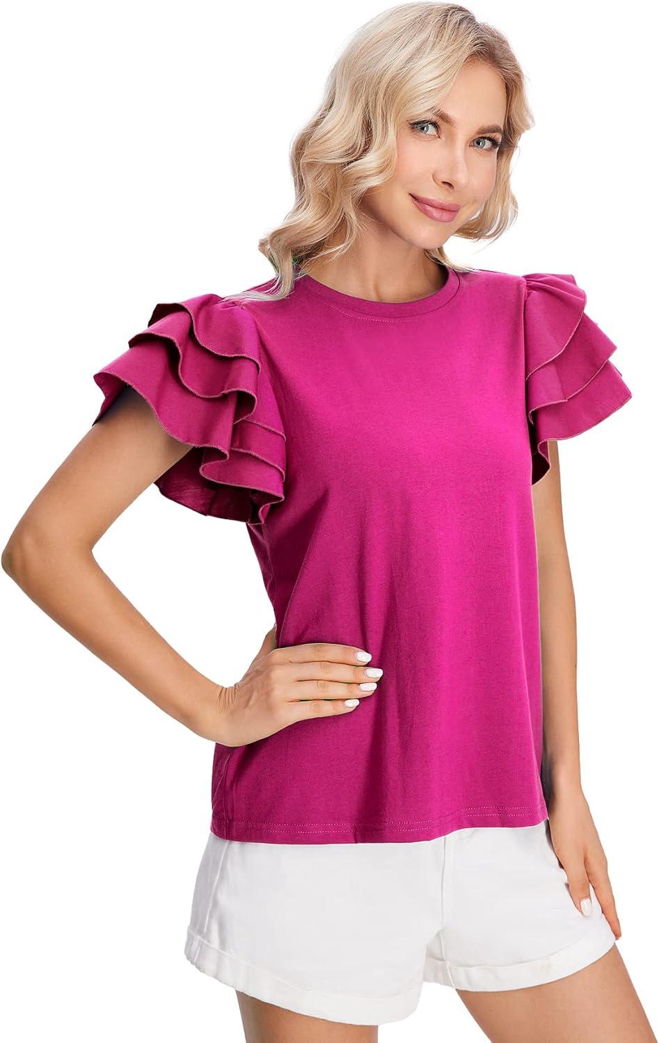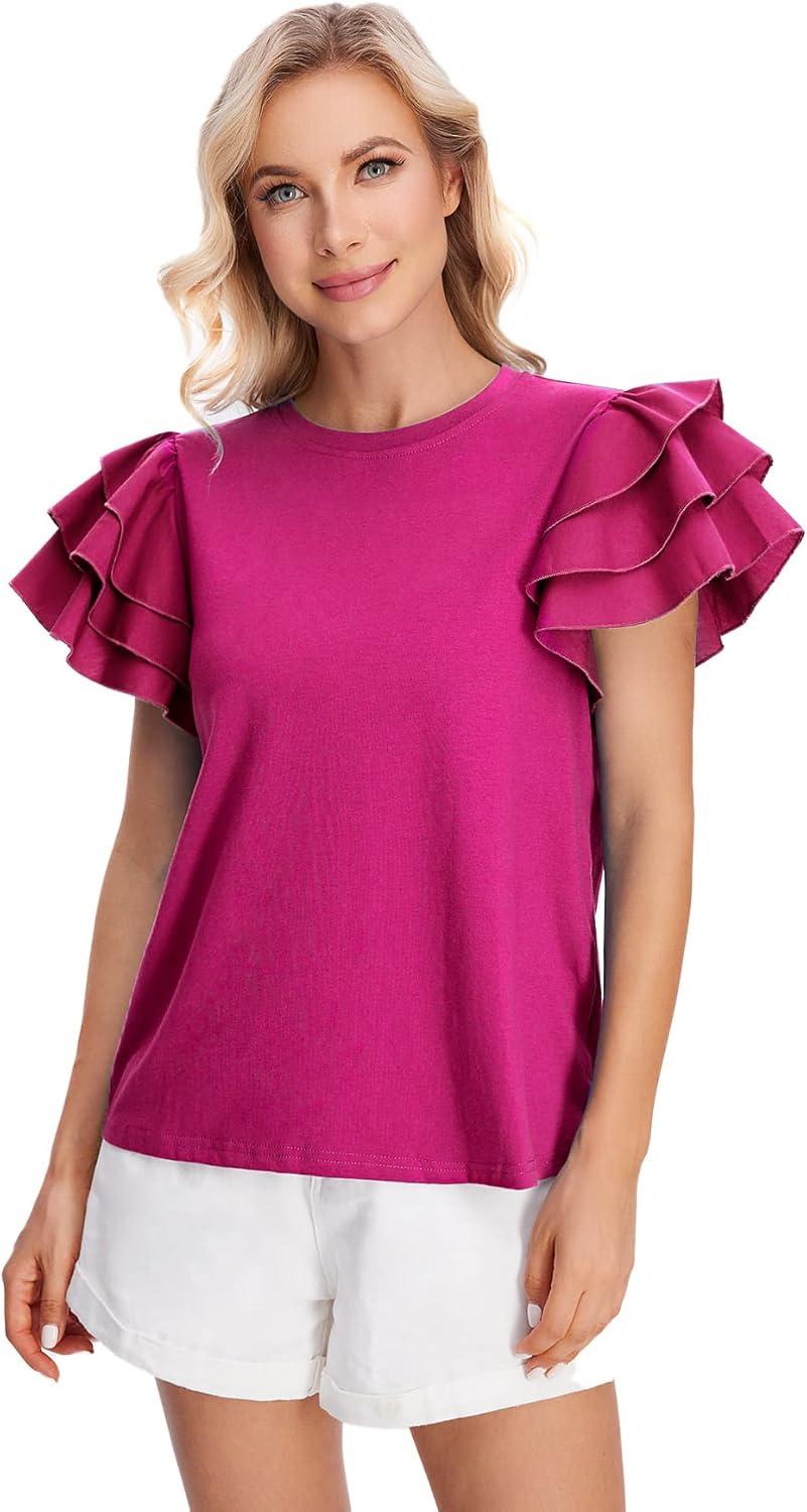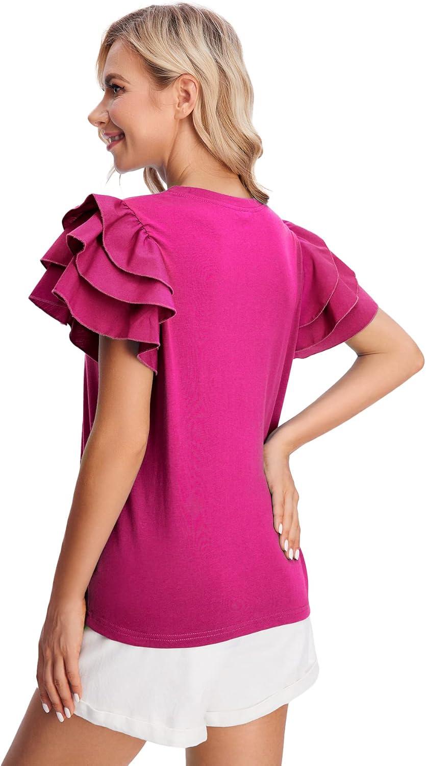 Verdusa Women’s Layered Ruffle Butterfly Sleeve Round Neck Blouse Tee Top(Hot Pink)