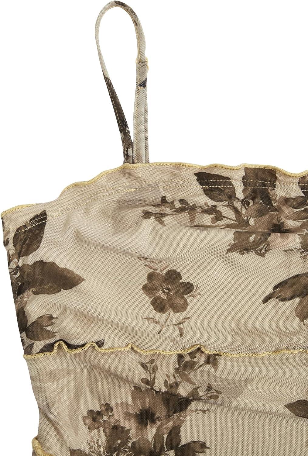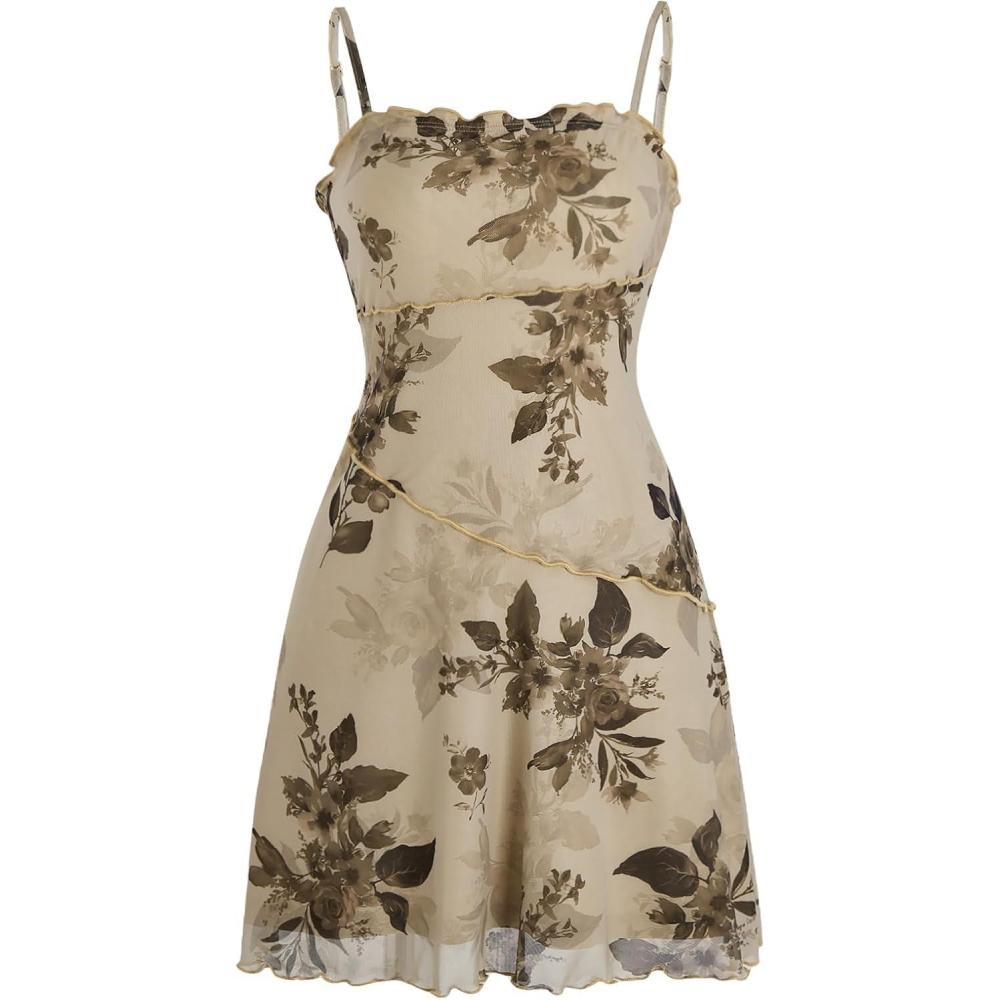 Verdusa Women's Lettuce Trim Floral Print Mesh Sleeveless A Line Short Cami Dress(Beige)