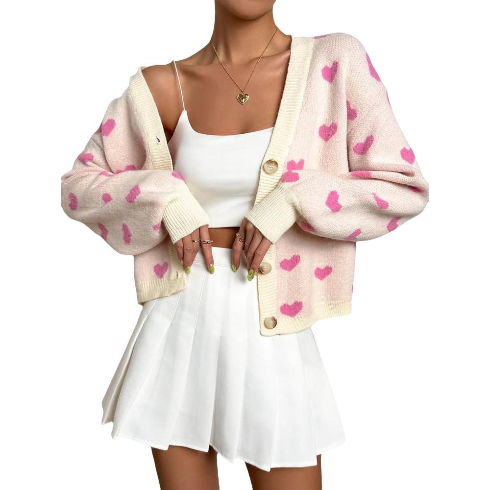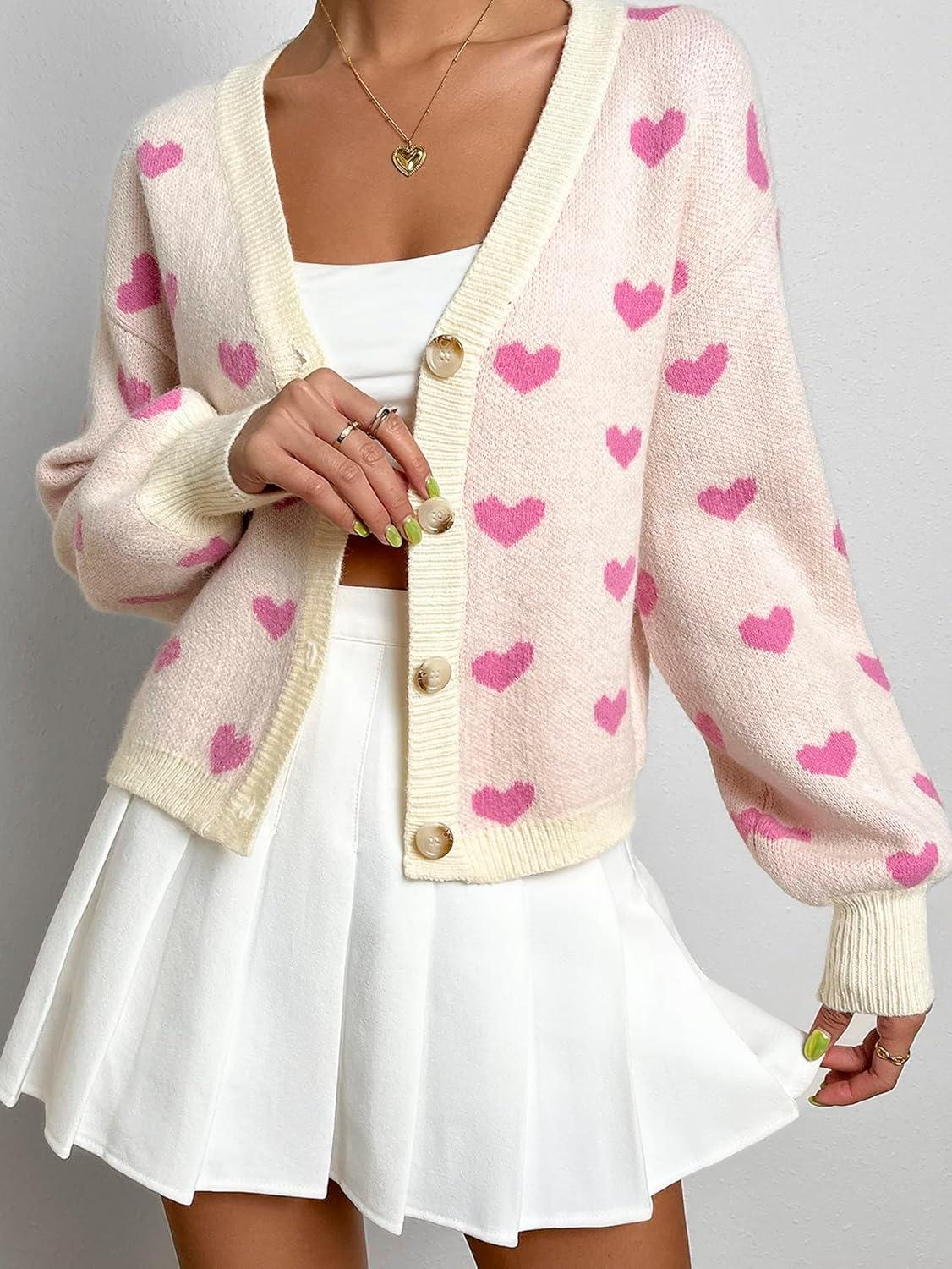 Verdusa Women’s Long Sleeve Print Button Front V Neck Knit Sweater Cardigan(Heart Pink)