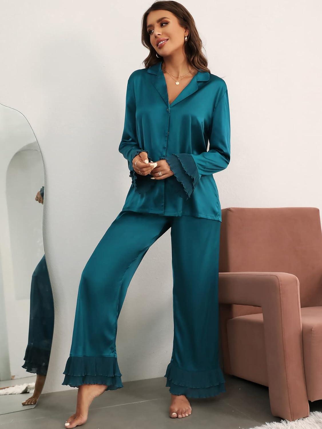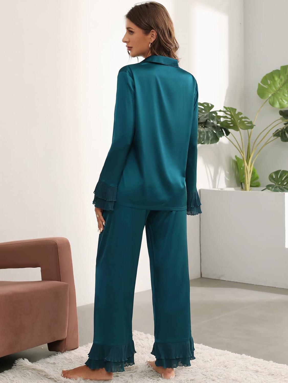 imageVerdusa Womens Satin Notch Collar Blouse and Ruffle Hem Pants PJ SetTeal Blue