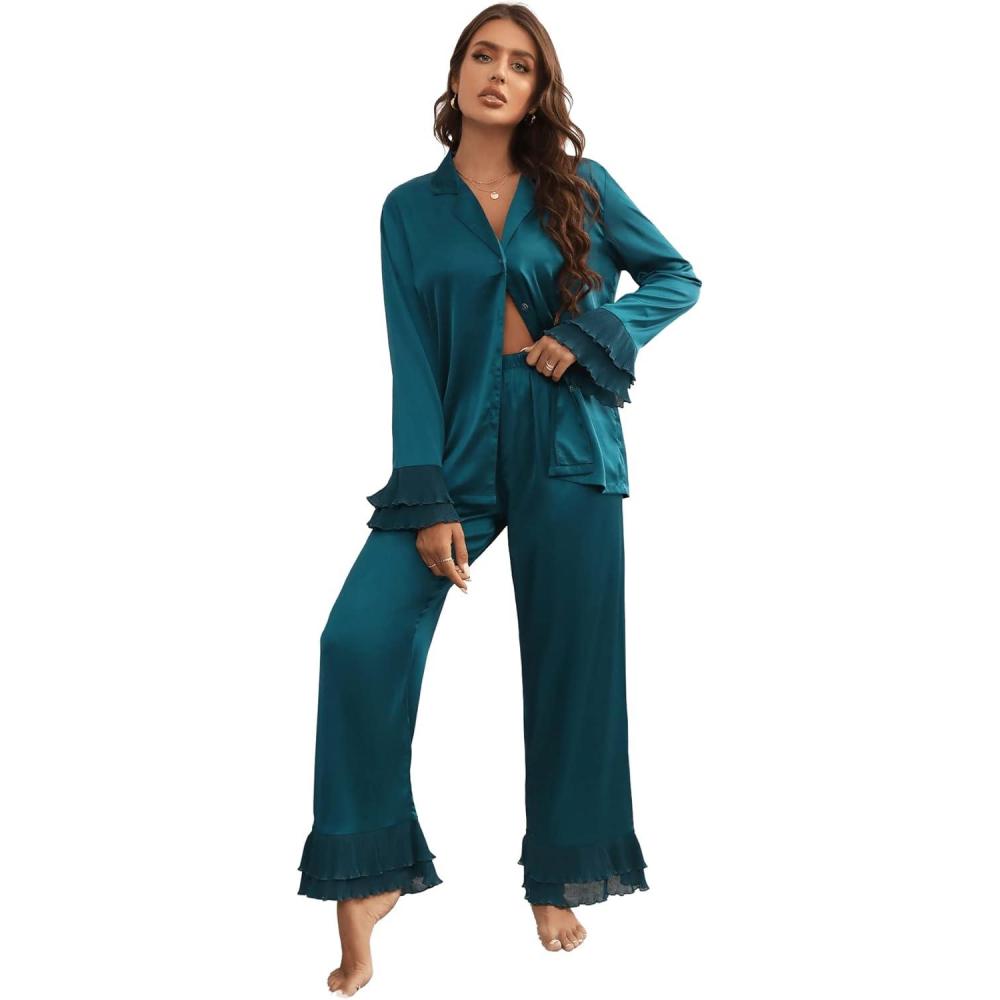 Verdusa Women’s Satin Notch Collar Blouse and Ruffle Hem Pants PJ Set(Teal Blue)