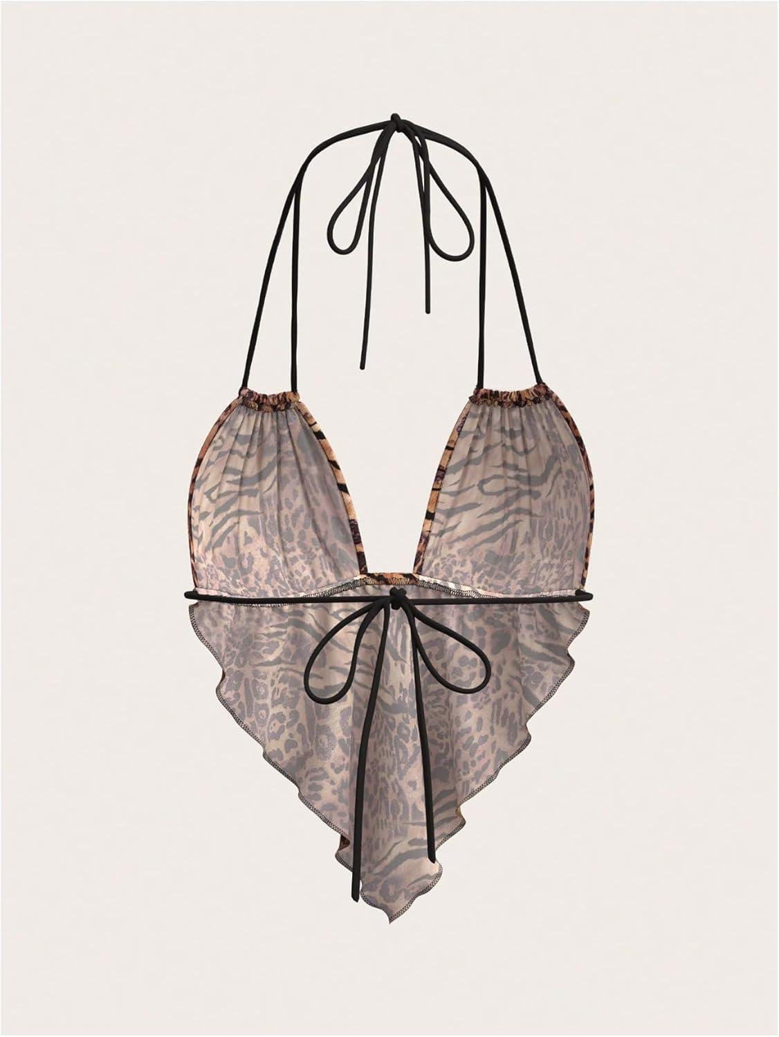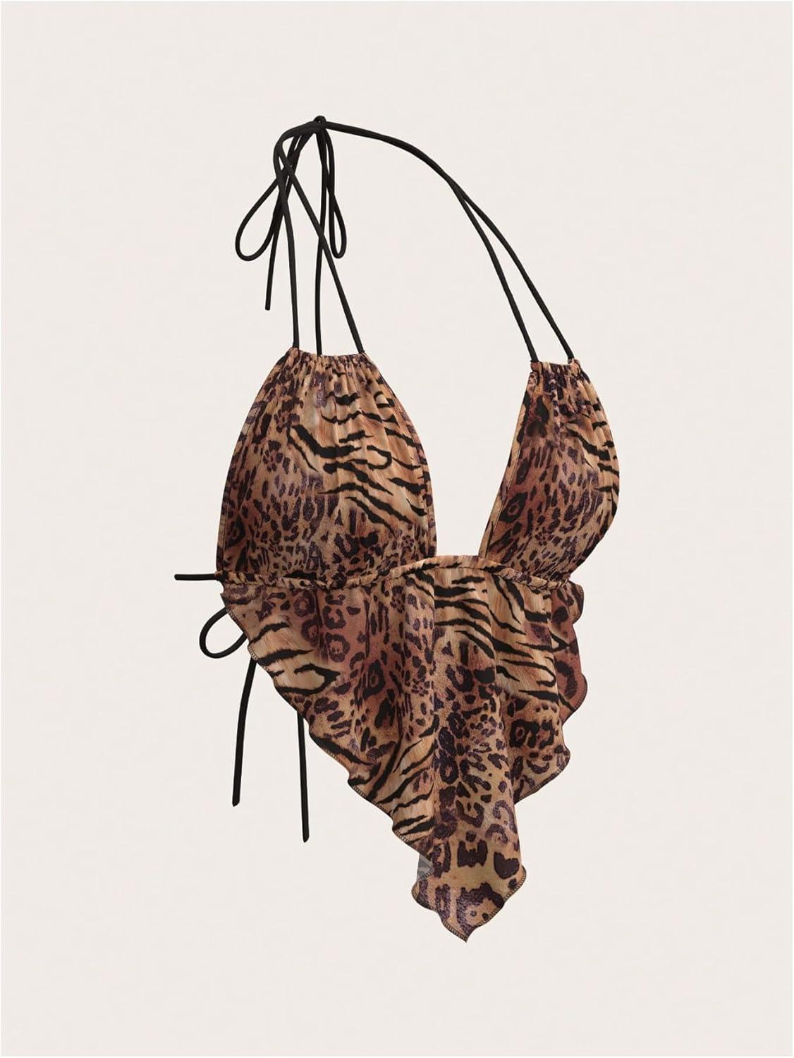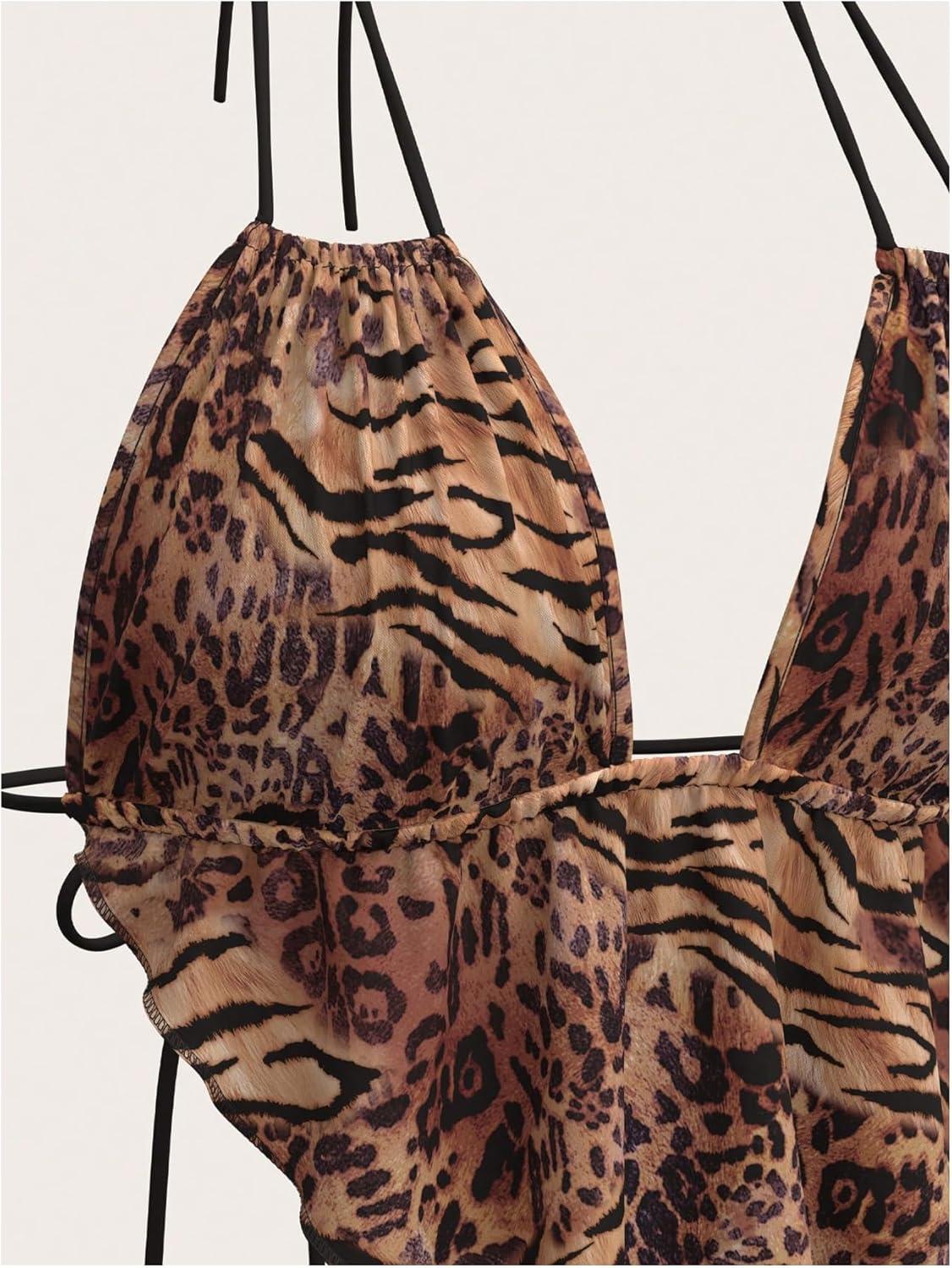Verdusa Women’s Sexy Leopard Print Deep V Halter Crop Tops Ruffle Going Out Top Party Clubwear(Brown)