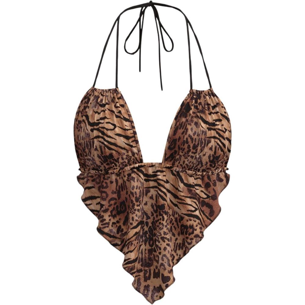 imageVerdusa Womens Sexy Leopard Print Deep V Halter Crop Tops Ruffle Going Out Top Party ClubwearBrown