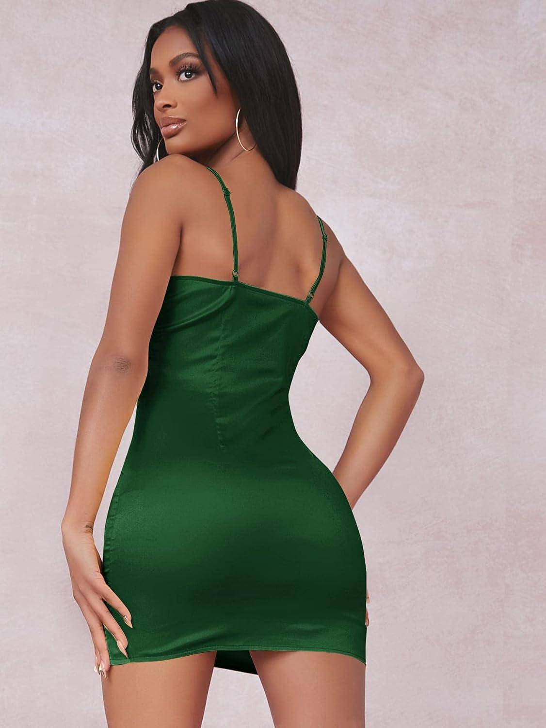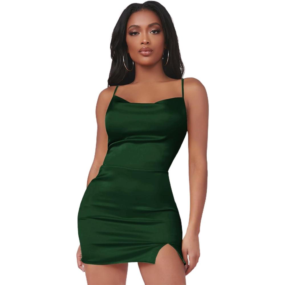 Verdusa Women’s Split Hem Cowl Neck Spaghetti Strap Satin Cami Bodycon Mini Dress(Dark Green Satin)