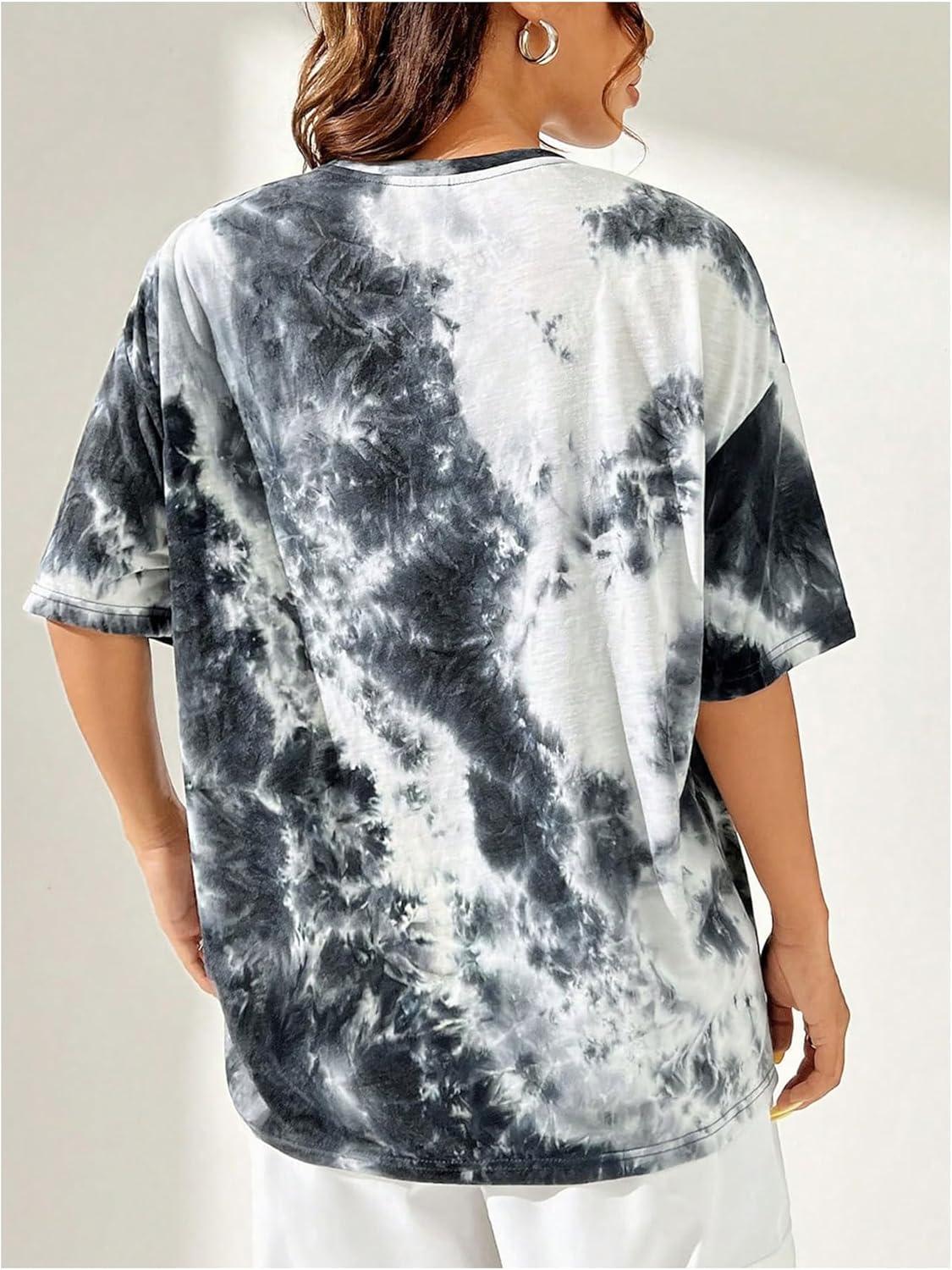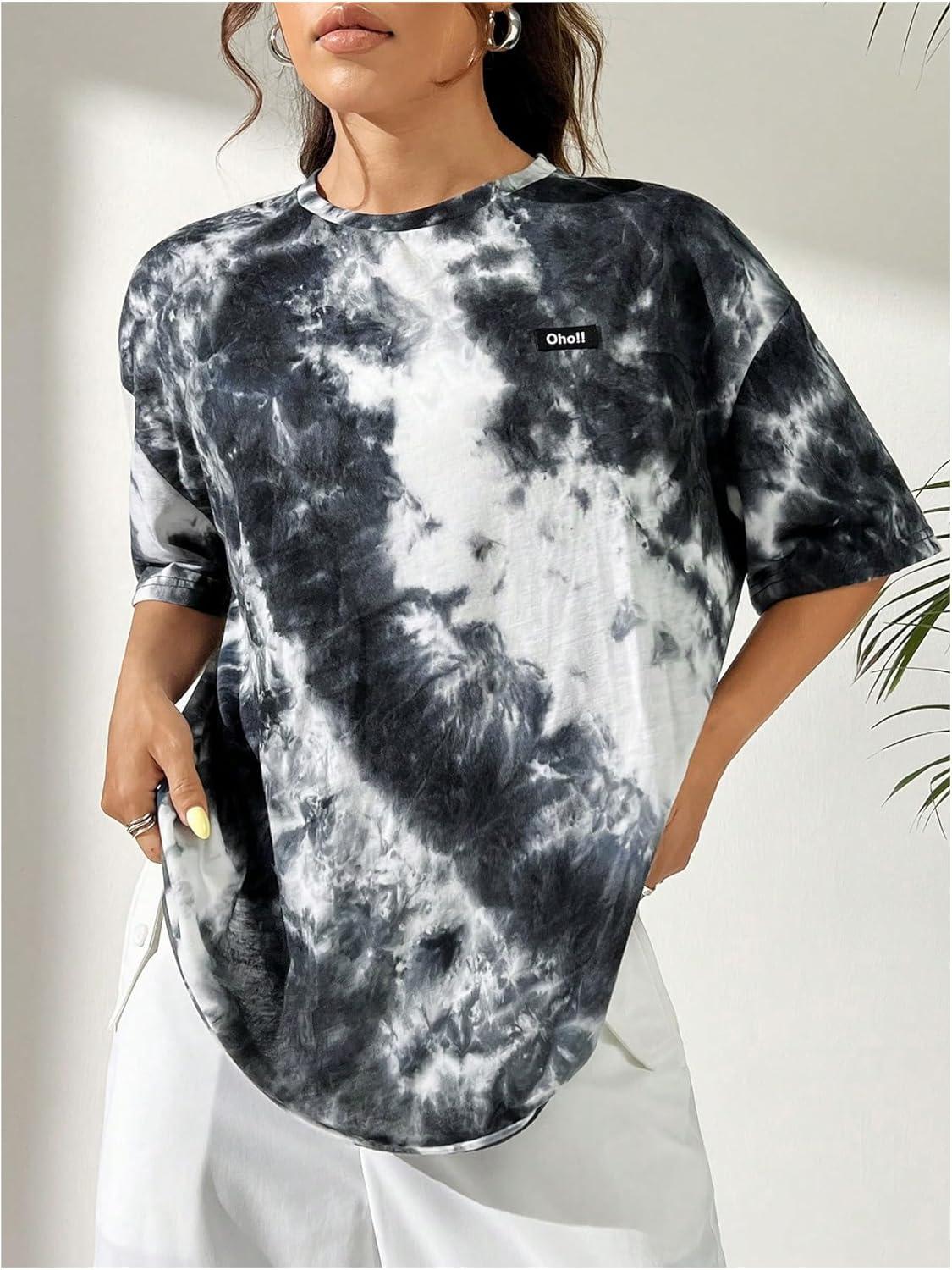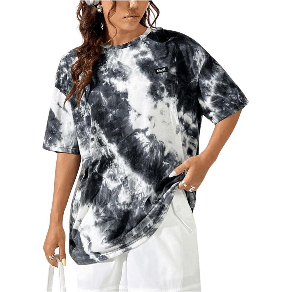 Verdusa Women's Tie Dye Summer Tees Half Sleeve Drop Shoulder T Shirt Oversized Top(Black and White)