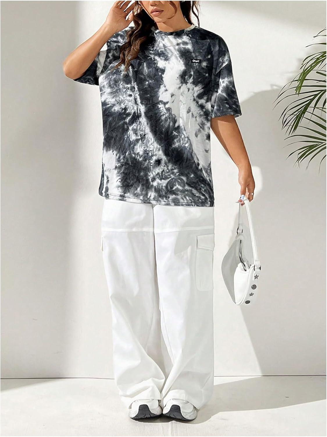 Verdusa Women’s Tie Dye Summer Tees Half Sleeve Drop Shoulder T Shirt Oversized Top(Black and White)